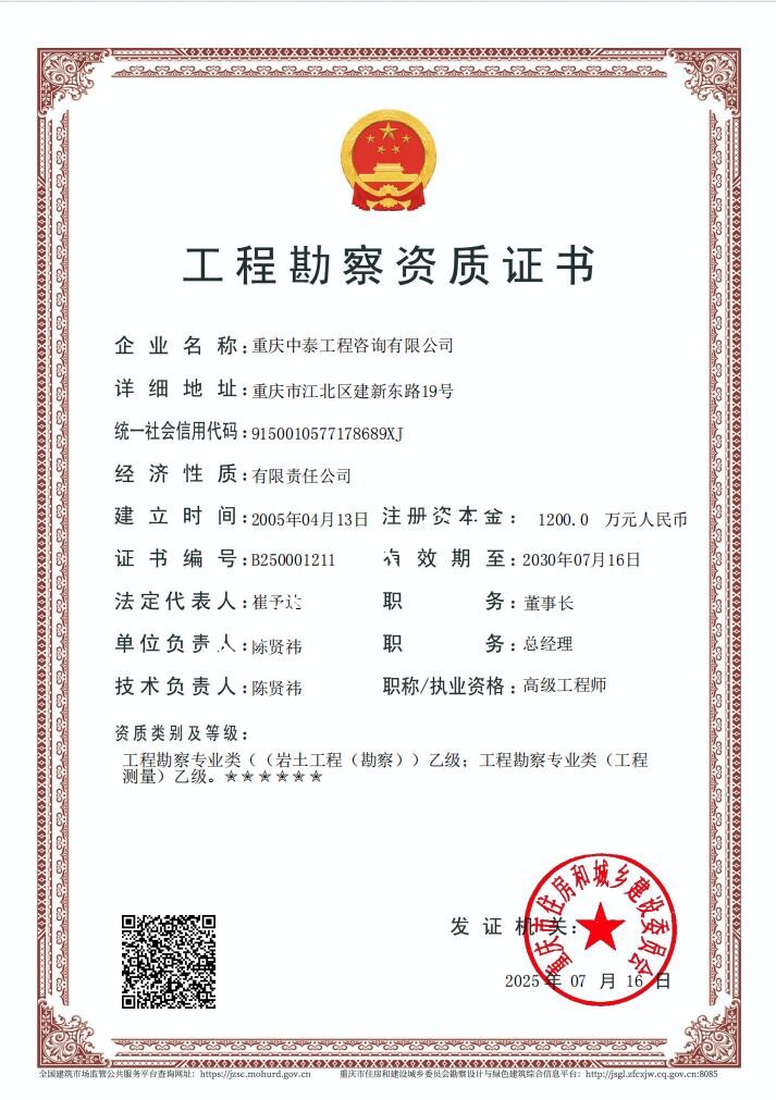 重慶中泰工程咨詢有限公司勘察測量資質(zhì)